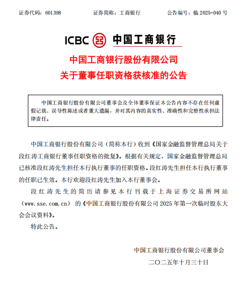 10月30日,中国工商银行股份有限公司发布关于董事任职资格获核准的公告国内正规最好的配资公司,国家金融监督管理总局已核准段红涛先生担任本行执行董事的任职资格。
