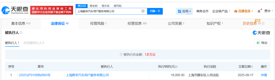 天眼查法律诉讼信息显示,9月17日,上海蔚来汽车用户服务有限公司新增一则被执行人信息,执行标的1.8万元,执行法院为上海市静安区人民法院。