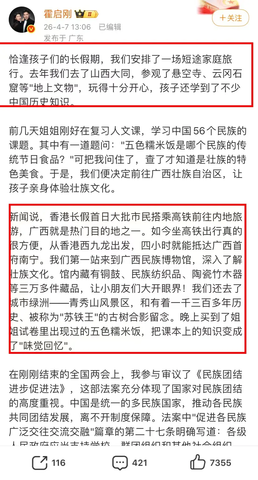 霍启刚发文表示这次小长假安排到广西游玩,去年他们一家到山西大同游玩,参观了悬空寺、云冈石窟等,玩得十分开心,孩子还学到了不少中国历史知识。